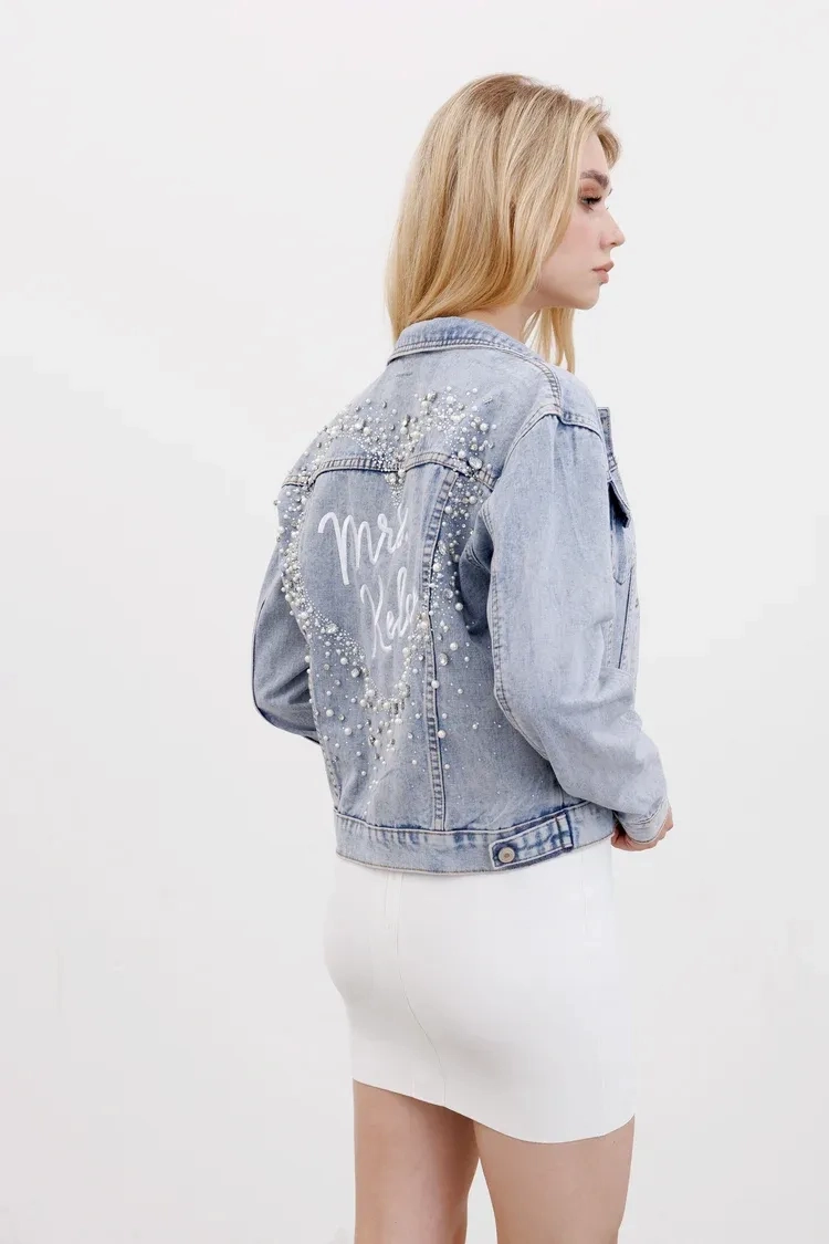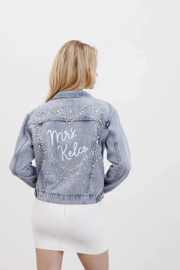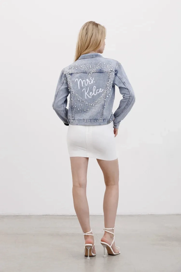 This BEAUTIFUL jean jacket is crafted with heavy duty, high quality denim and then adorned with tiny crystals, faux pearls, and rhinestones on the back that were each individually hand set ontothe jacket by expert seamstresses to create the prettiest heart shape.